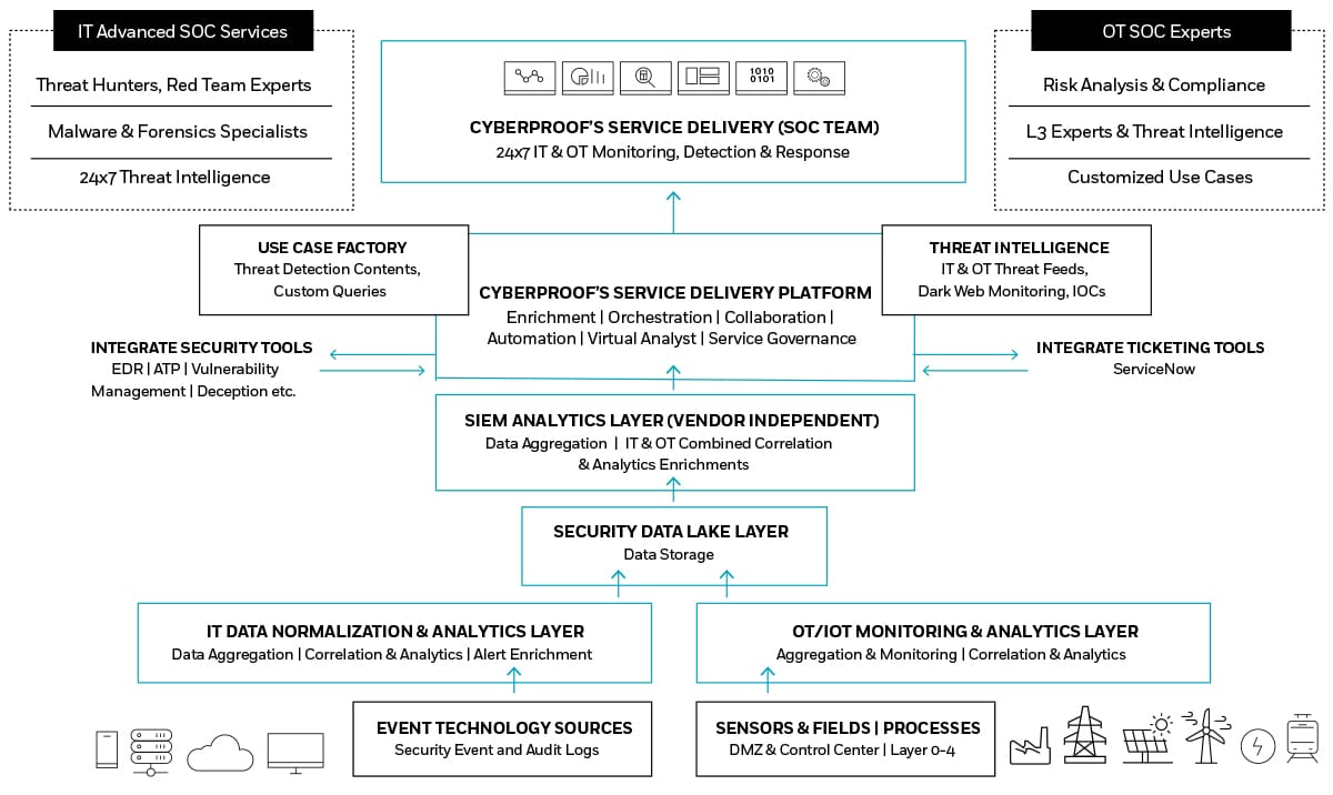 CyberProof partnered with ICS/SCADA technology vendors for the development and implementation of new hardware and software solutions per the approved architecture. The team installed and configured the necessary hardware sensors, intrusion detection system (IDS), and agents to collect logs in real time from BMS systems (i.e., both IT and OT systems) and sent data to the CyberProof service delivery platform.